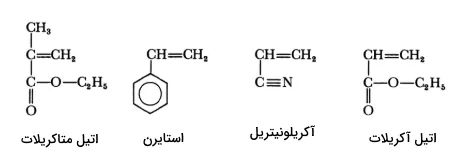 در تصویر بالا تعدادی از مونومرهایی را مشاهده می‌کنید که به‌طور معمول در سنتز پلیمرهای محلول آکریلیکی به کار گرفته می‌شوند. همچنین از مونومر وینیل‌ کلرید و وینیل استات برای تهیه دو پلیمر پلی‌وینیل کلرید و پلی‌وینیل استات استفاده می‌شود. در جدول زیر تعدادی مونومر را به همراه پلیمرهای آن‌ها، مشاهده می‌کنید.