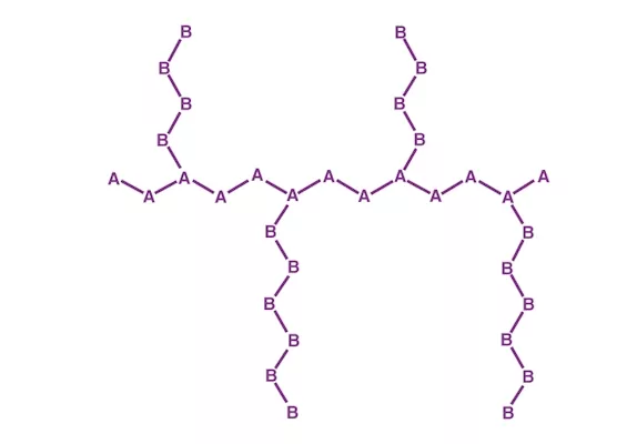 به پلیمری که دارای زنجیره‌های اصلی و فرعی با توالی‌های متفاوتی از مونومر باشد، «کوپلیمر پیوندی» (Graft Copolymer) گفته می‌شود. در زیر نمونه‌ای از این کوپلیمر را مشاهده می‌کنید که از دو مونومر A و B