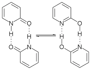 به این صورت که هیدروژنی متصل به اتمی قطبی (با بار مثبتی بیشتر از هیدروژن در حالت عادی) با یک اتم قطبی (به‌طور معمول اتم اکسیژن) برهمکنش‌ می‌دهد. در بالا نمونه‌ای از دیمر غیرکووالانسی را مشاهده می‌کنید که از «۲-پیریدون» به وجود می‌آید و در آن شاهد تشکیل پیوند هیدروژنی هستیم.