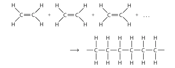 همان‌طور که مشاهده می‌کنید این ساختار توانایی گسترش از هر دو سمت را دارد. توجه داشته باشید که تمام اتم‌های مونومر شامل دو کربن و چهار هیدروژن، در ساختار پلیمر شرکت می‌کنند. روند انجام این واکنش را می‌توان به‌صورت زیر نیز نمایش داد زیرا روش بالا وقت‌گیر و ناکارآمد است.