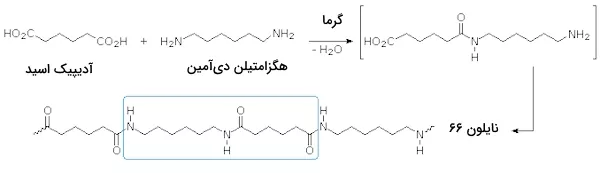 نمایش داد. «نایلون ۶۶» مثالی از این نوع پلیمر است که در آن مونومرهای «هگزامتیلن دی‌آمین« و «آدیپیک اسید« به‌صورت یک در میان آمده‌اند. این کوپلیمر را می‌توان به‌صورت ساده زیر نشان داد