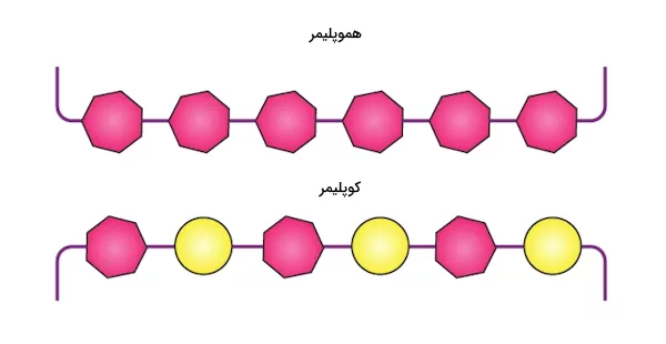 همچنین یک «هموپلیمر» (Homopolymer)، پلیمری است که مونومرهای سازنده آن همگی از یک نوع باشند. در تصویر زیر به صورت بسیار ساده به تفاوت‌های این دو نوع پلیمر پرداخته‌ایم.