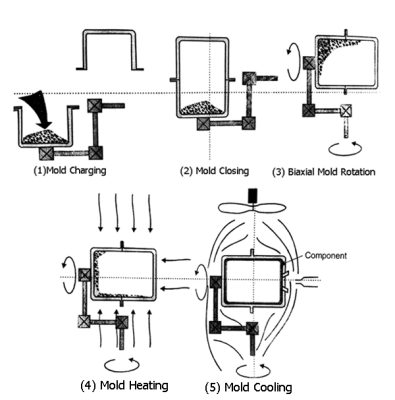 شش مرحله در فرآیند قالب‌گیری چرخشی وجود دارد:
