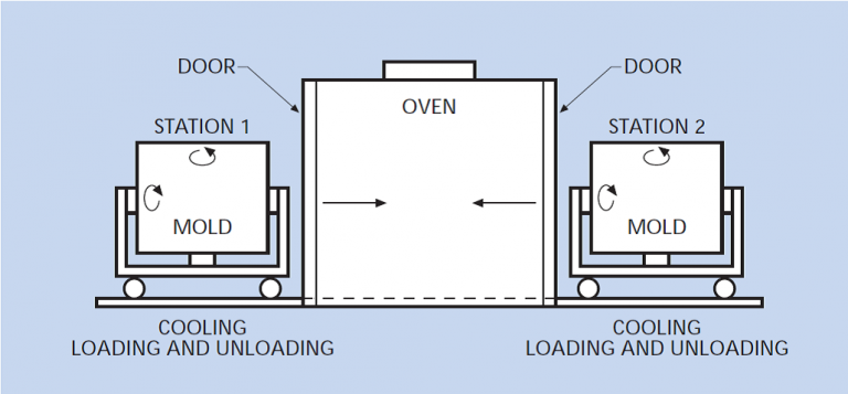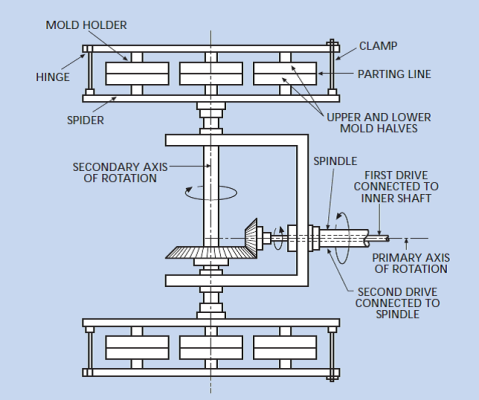 تجهیزات مورد استفاده در قالب‌گیری چرخشی، ساده اما متنوعند (شکل 7). رایج‌ترین نوع این ماشین‌ها، ماشین چند اسپیندل (multiple-spindle) یا چرخ و فلکی (carousel) است. ماشین‌های carousel عمدتاً چرخی شکل هستند. اسپیندل‌ها که گروهی از قالب‌های کوچک‌تر یا یک قالب بزرگ را حمل می‌کنند، به یک توپی اصلی متصل می‌شوند. بیش‌تر carouselها در چرخیدن یک دور کامل دایره‌ای، آزادی عمل دارند.