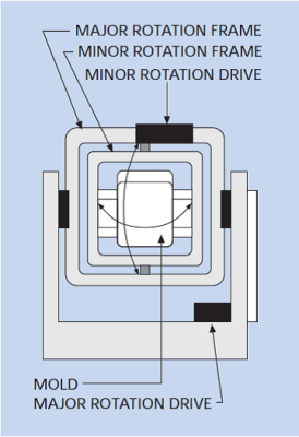 جدیدترین تجهیز قالب چرخشی، تکنولوژی قالب کامپوزیت Wytkin یا CMT (Composite Mold Technology) است که در آن قالب به‌طریق الکتریکی گرم و به وسیله هوا سرد می‌شود (شکل 11).