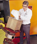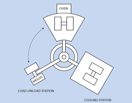 3. قالب پرشده در یک آون با حرارت بالا قرار داده می‌شود که هم‌زمان تحت چرخش توسط دو صفحه در دو محور عمود بر هم قرار دارد.